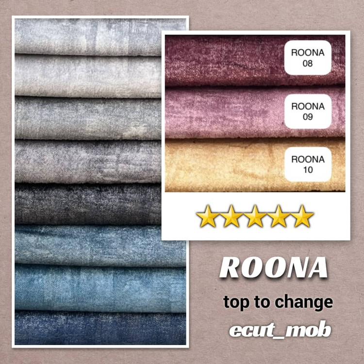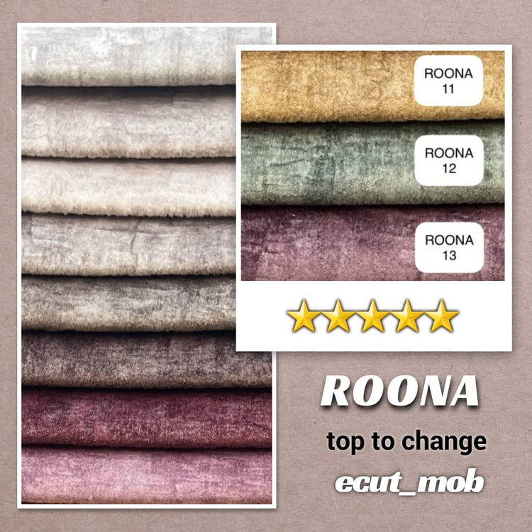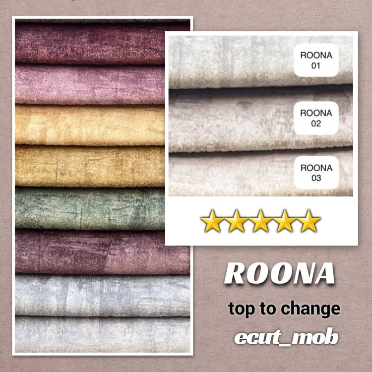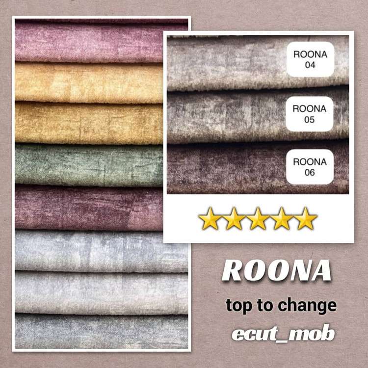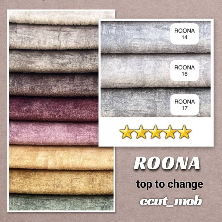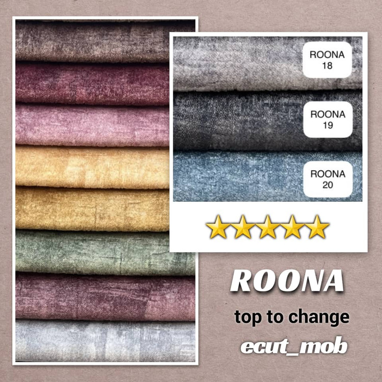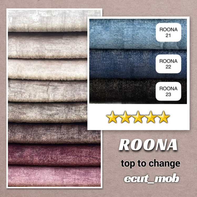 پارچه مبلی رونا دارای ۲۳ رنگ متنوع است و با ویژگیهای ضد سایش، ضد لک و مقاوم در برابر نور خورشید، برای مبلهای راحتی، مدرن و مینیمال بسیار مناسب است.